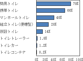 次に、自治体が備蓄している災害トイレの種類を図−3に示す 5)。自治体は、主に簡易トイレ、携帯トイレ、マンホールトイレ及び組立トイレ(便槽型)を備蓄するとともに、災害協定等により仮設トイレの確保を図っている。