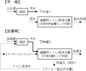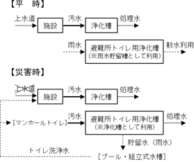 上記の事例以外にも、避難所トイレへの浄化槽の活用方法が提案されている 8)。図−10は、浄化槽処理区域に避難所トイレ用浄化槽を設置する場合の例である。平時には雨水貯留槽として利用し、災害時に溜めた雨水を別の水槽に移してトイレ洗浄水として利用する。また、浄化槽のマンホール蓋もしくは上流側の配管上部にマンホールトイレを設置することで、災害時にトイレ数が不足した場合に対応する。