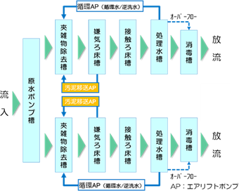 今回の対応範囲拡大では、従来のPV型を多系列並列配置し、その前段に配置した原水ポンプ槽内の原水分配装置によって均等に流入させる方式を採用しています。処理フローを図2に示します。また、前段に配置する原水ポンプ槽の概要を図3に示します。