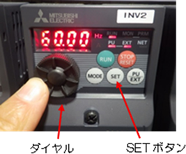 周波数の設定は、インバータのダイヤルを回して目標値に合わせ、「SET」ボタンを押すことで完了します。ポンプ停止時は「0.00」、 ポンプ稼働時は設定した周波数が表示されます。(詳細は、付属のインバータの取扱説明書をご確認ください。)