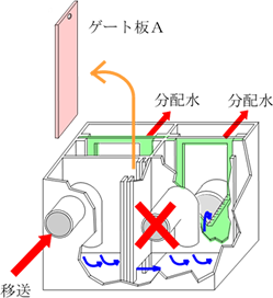 原水ポンプが故障した場合でも、他のポンプが1台でも稼働するようであれば、応急措置が可能です。具体的には、原水分配装置内のゲート板Aを一時的に取り外すことで、隣接系列へ原水を移送できます(図8)。